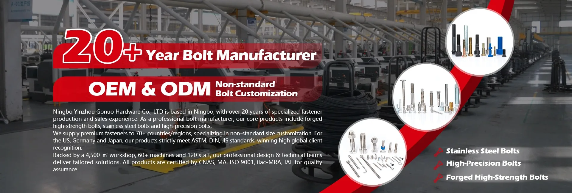 Ningbo Yinzhou Gonuo Hardware Co., LTD is based in Ningbo, with over 20 years of specialized fastener production and sales experience. As a professional bolt manufacturer, our core products include forged high-strength bolts, stainless steel bolts and high-precision bolts.